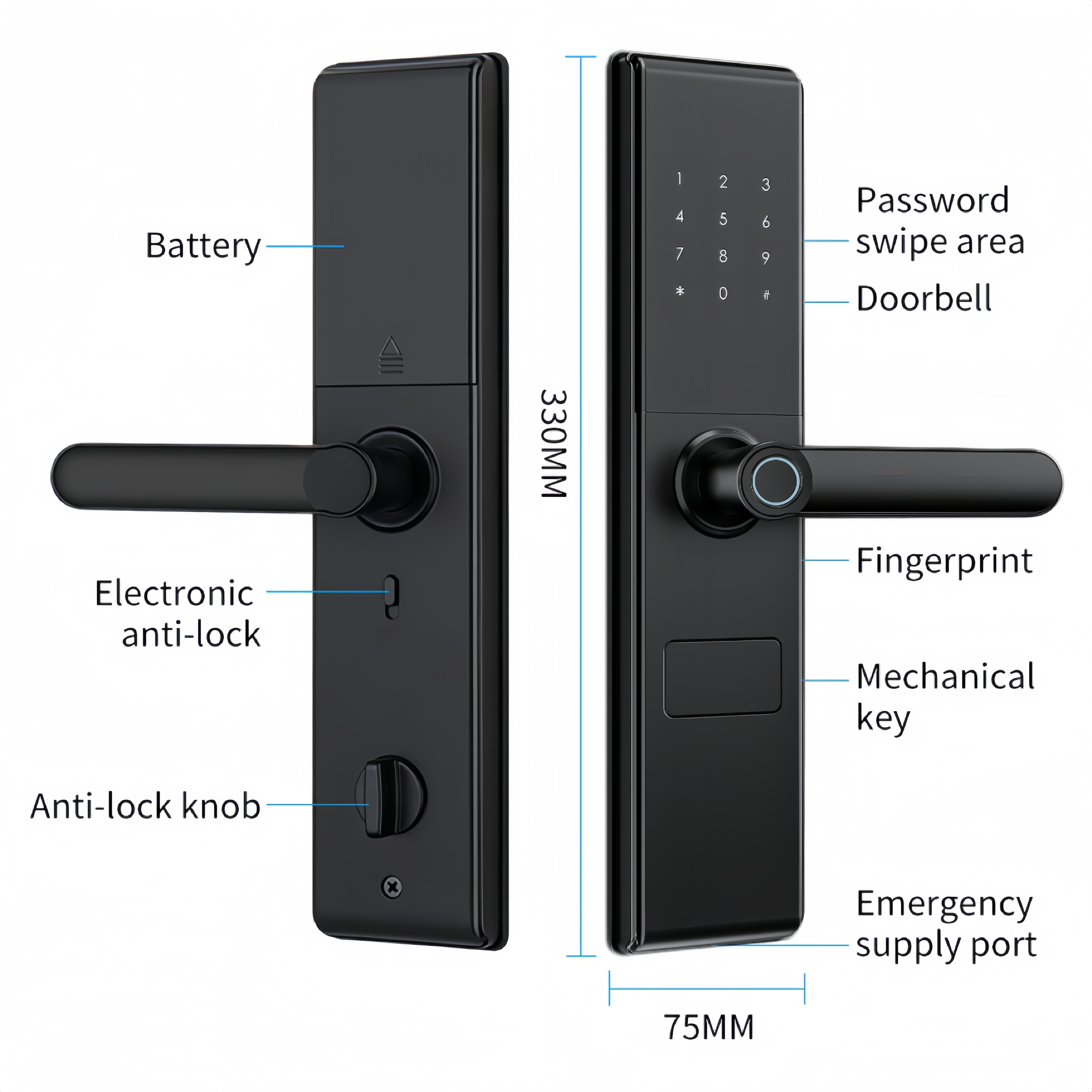 | Материал: | Алюминиевый сплав | Разблокировать путь: | Приложение Tuya, пароль, отпечаток пальца, карта, ключ и USB-порт |